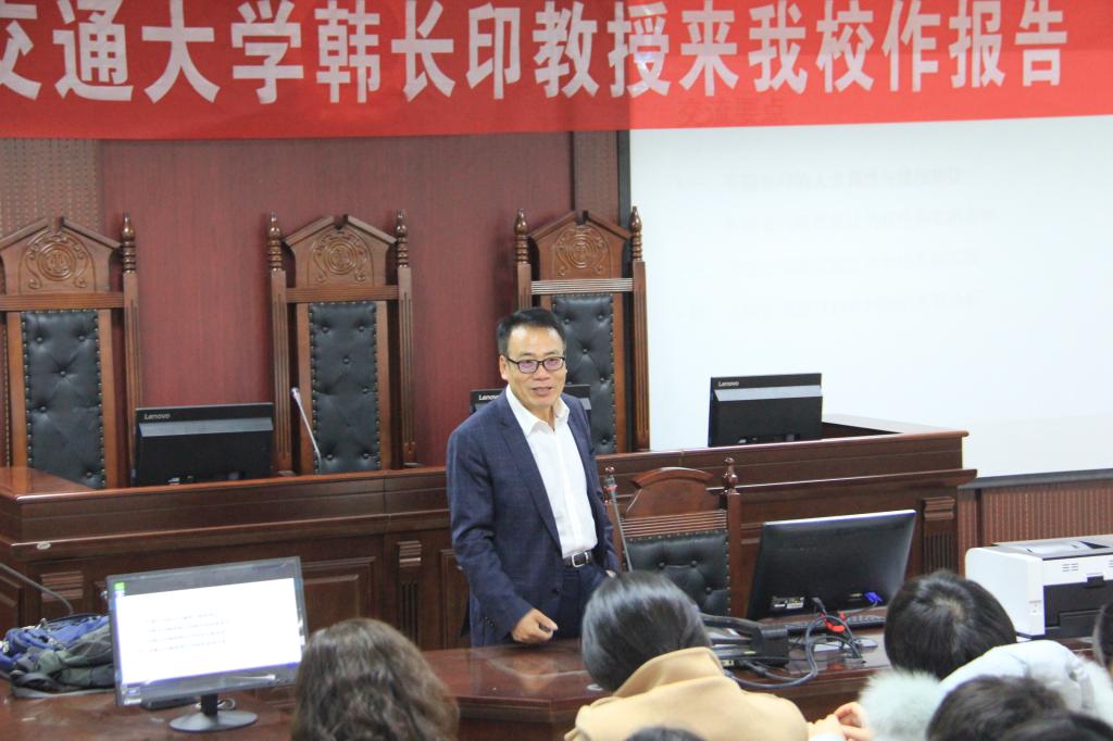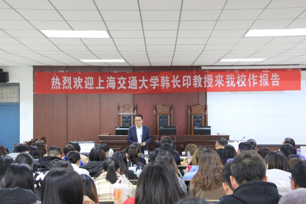 (通讯员魏丽君)12月4日下午14:30,公司客座教授上海交通大学博士生导师韩长印教授在模拟法庭开展题为“有限公司股权转让法律问题”的讲座。讲座由太阳成tyc122cc集团经理王艳芳主持,部分教师代表及员工三百余人参加。
