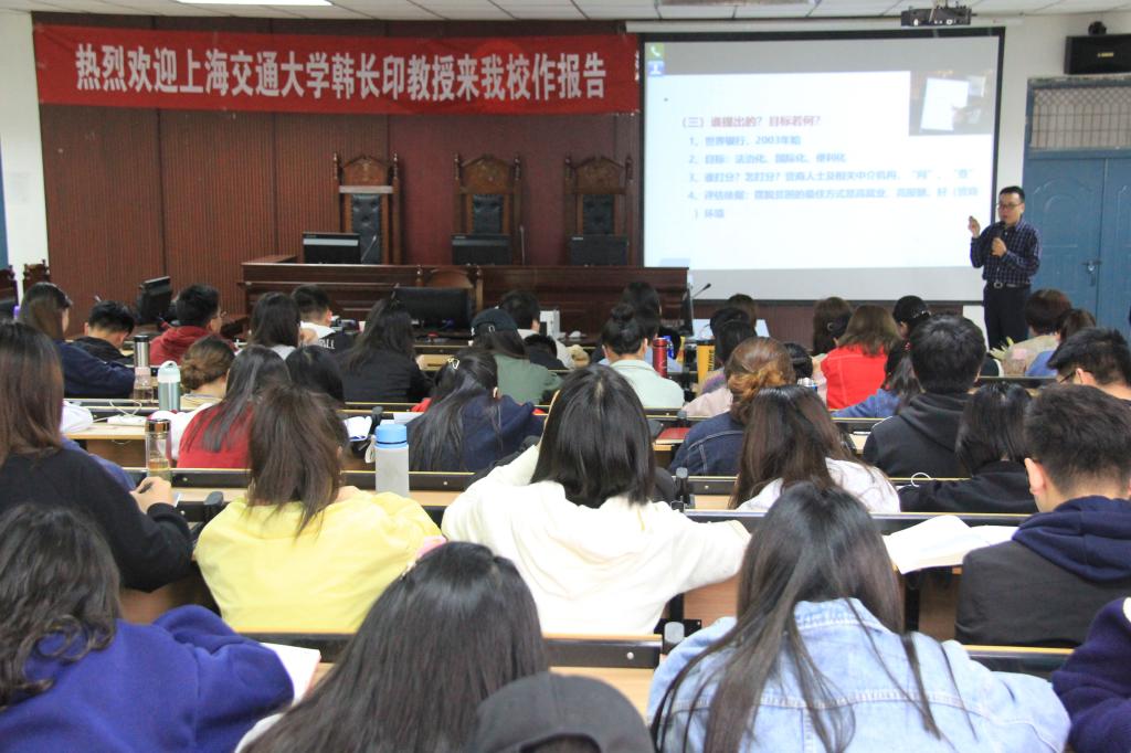 (通讯员:魏丽君)5月7日下午,公司客座教授上海交通大学博士生导师韩长印教授在模拟法庭开展题为“营商环境法律问题”的讲座。讲座由太阳成tyc122cc集团经理王艳芳主持,太阳成tyc122cc集团全体教工及部分员工参加。