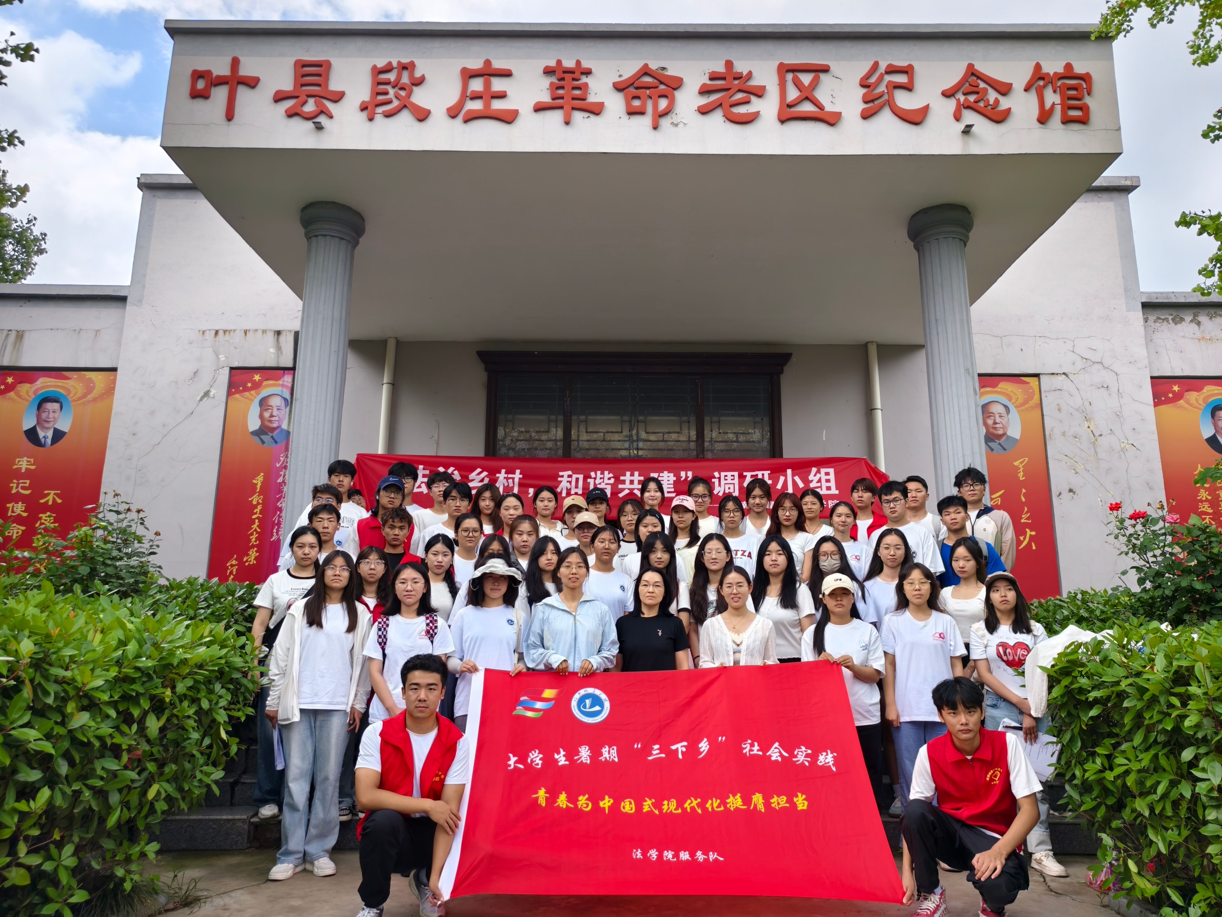 社会调查分组进行,分别开展“美丽乡村,全民普法”“法治乡村、和谐共建”社会调查活动和“青春为中国式现代化挺膺担当”社会实践活动。师生深入叶邑镇、田庄乡等,发放普法宣传页,开展社会调查,接受村民具体纠纷的法律咨询。师生还到被誉为鹰城红色第一村的叶邑镇段庄村,缅怀先烈,接受红色教育。