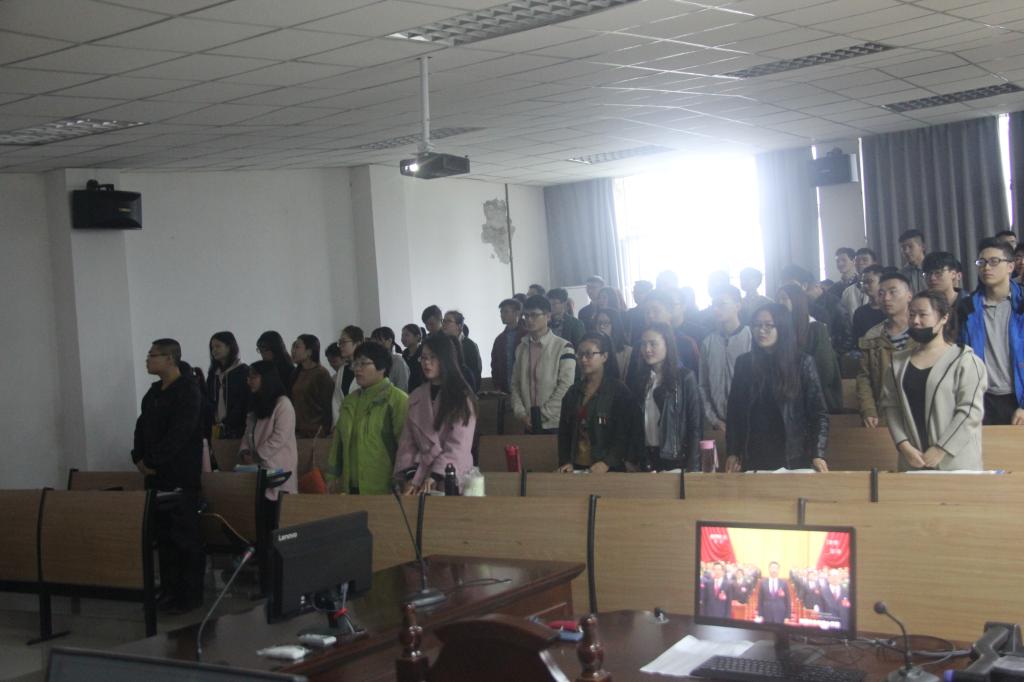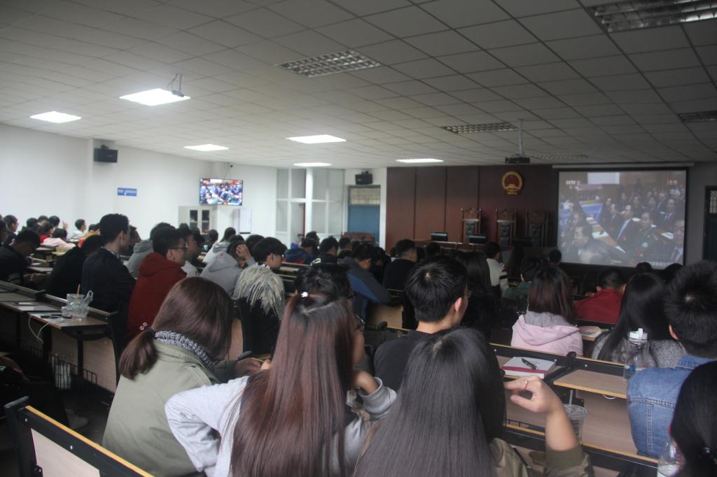 为喜接党的十九大胜利召开,太阳成tyc122cc集团全体同学于10月18日9时在一号教学楼模拟法庭,观看中国共产党第十九次全国代表大会开幕盛况,认真聆听习近平总书记代表十八届中央委员会所作的大会报告。