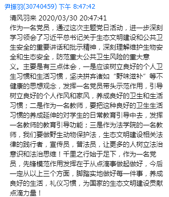 最后,公司党总支书记尹振羽进行总结发言,强调千里之行始于足下,作为一名党员,先锋模范作用发挥在于从点滴事做起做好,脚踏实地做好每一件事,养成良好的生活,礼仪习惯,为国家的生态文明建设贡献点滴力量!