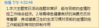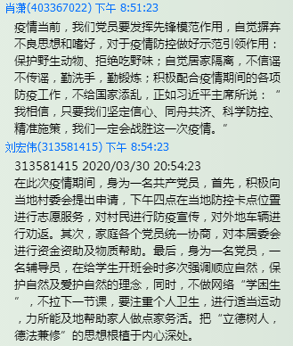 接着,张晓娟、潘巧红、魏丽君等就这一倡议,结合自身生活工作实际发表了口头或书面感言,表示坚决贯彻落实习近平总书记重要指示精神,践行省委组织部倡议,发挥党员示范带头作用,积极推动文明健康、绿色环保生活方式的形成。