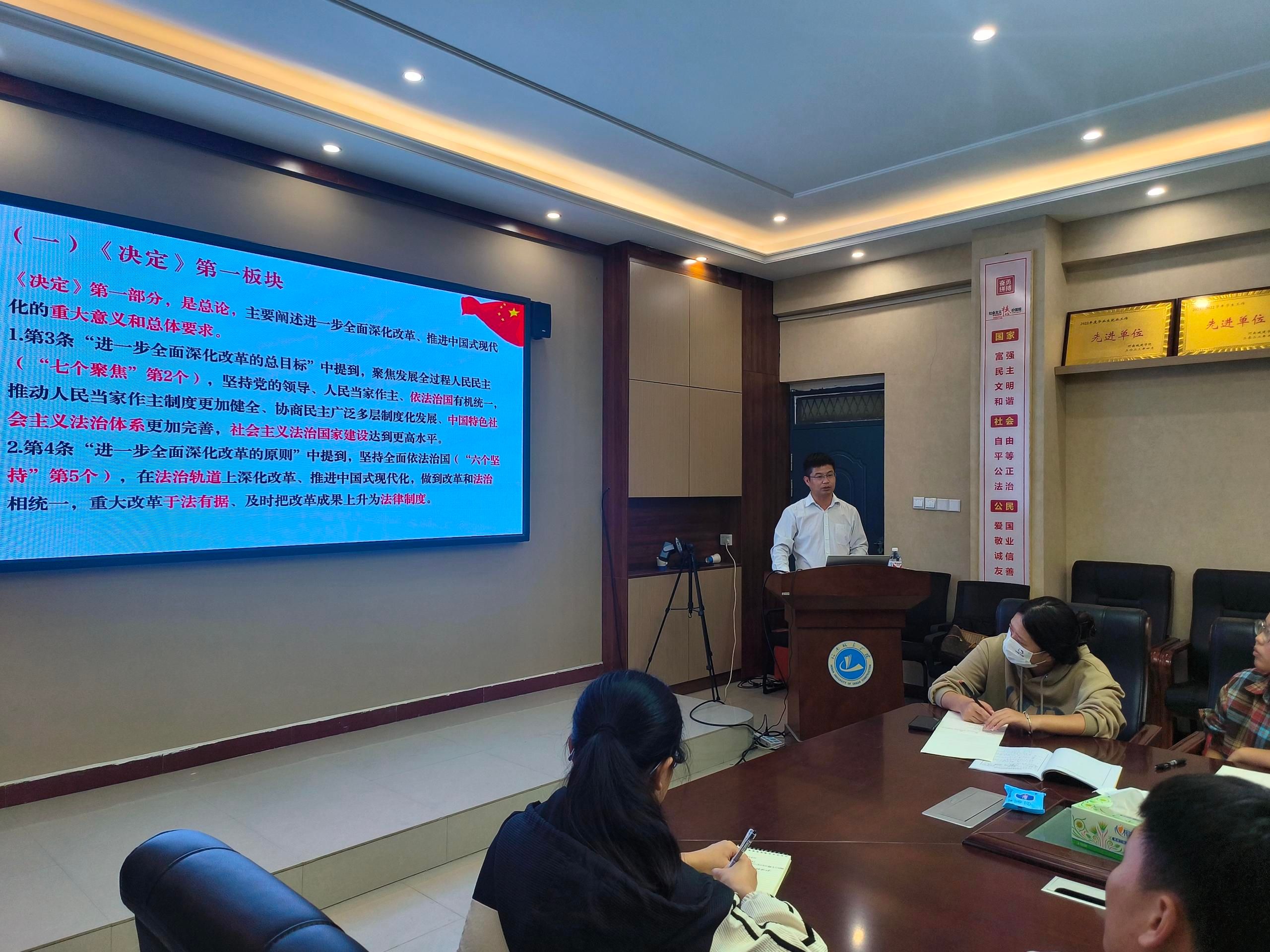 苗道华以“党的二十届三中全会《决定》中的‘法治’元素”为题,介绍了党的二十届三中全会的召开盛况,解读了二十届三中全会的主要内容,重点分析了《中共中央关于进一步全面深化改革、推进中国式现代化的决定》(以下简称《决定》)中的“法治”元素,并结合太阳成tyc122cc集团实际情况,就如何学习宣传贯彻好《决定》,谈了自己的认识和思考。报告主题鲜明、逻辑清晰,重点突出、分析细致,深入浅出、通俗易懂。