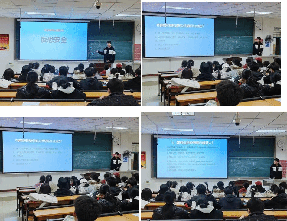 法律协会通过宣传版面、宣传横幅、主题班会等多种形式,向同学们介绍《中华人民共和国反恐怖主义法》及反恐相关法律基础知识,让员工们了解总体国家安全观及防范暴力恐怖袭击的重要意义、什么是恐怖主义、怎么防范恐怖主义袭击以及如何应对恐怖主义袭击等相关知识,并深入介绍暴恐活动的社会危害、特征及常用手段,详细讲解了当前反恐刑事的复杂性,呼吁广大同学“多一份警惕,多一分安全”,广泛参与、积极配合反恐怖工作,切实提高防范应对恐怖袭击的意识和能力,营造全民反恐的良好社会氛围。通过引导同学们加强自身防护意识、学习安全防范知识,做到能发现、能识别、能避险、会举报、会自救、会应对,呼吁广大师生要切实增强校园安全防范意识。