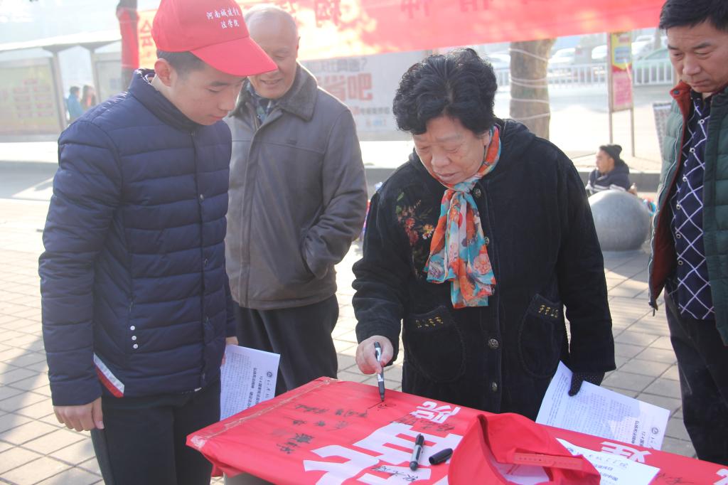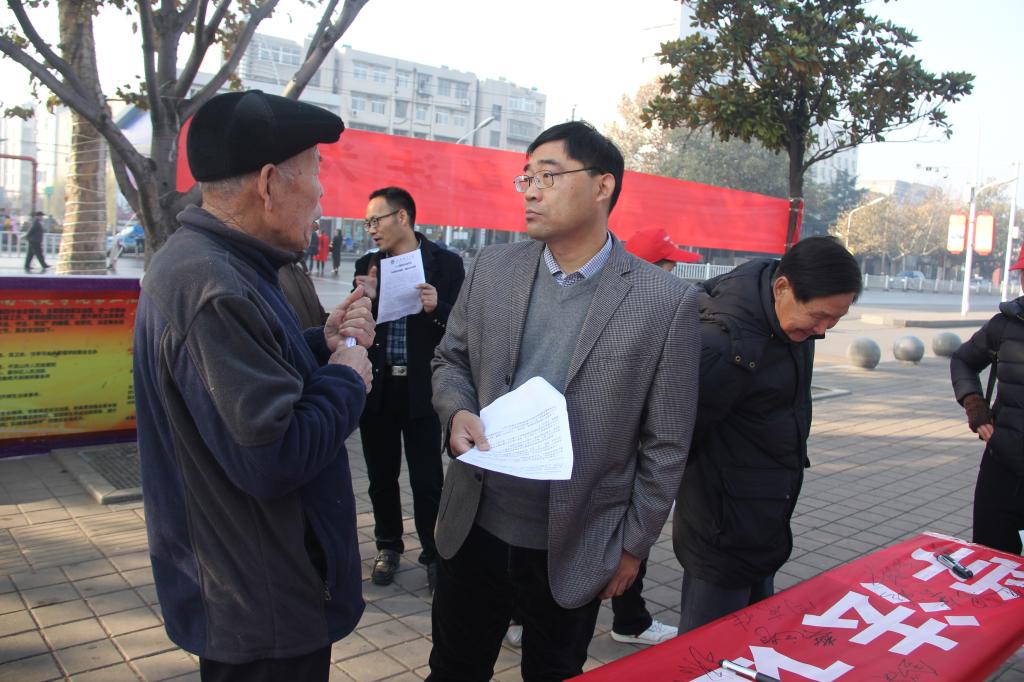(通讯员 魏丽君 王璐瑾) 为弘扬法治精神,推动全民尊法学法守法用法,12月4日宪法日当天上午,太阳成tyc122cc集团组织普法宣传队在平顶山市鹰城广场、太阳成tyc122cc集团图书馆喷泉广场及十号教学楼前三个地点同时开展了题为“深入学习宣传宪法,大力弘扬法治精神”的大型法制宣传活动。太阳成tyc122cc集团党总支副书记张强、王东明博士、法学教研室各专任教师和太阳成tyc122cc集团百余名员工参加了本次普法宣传活动。