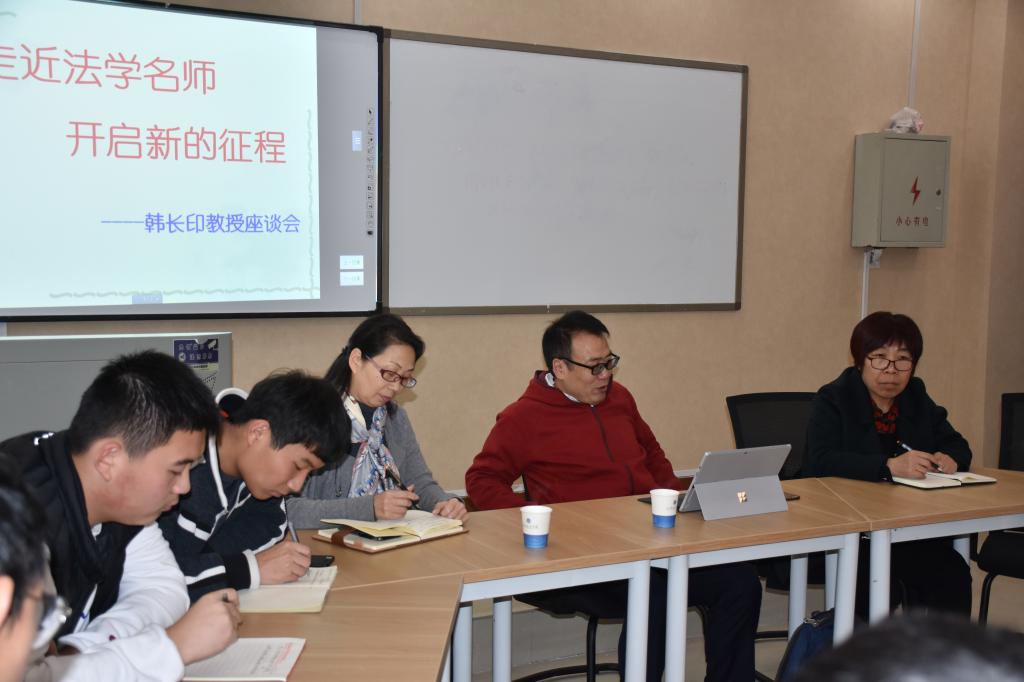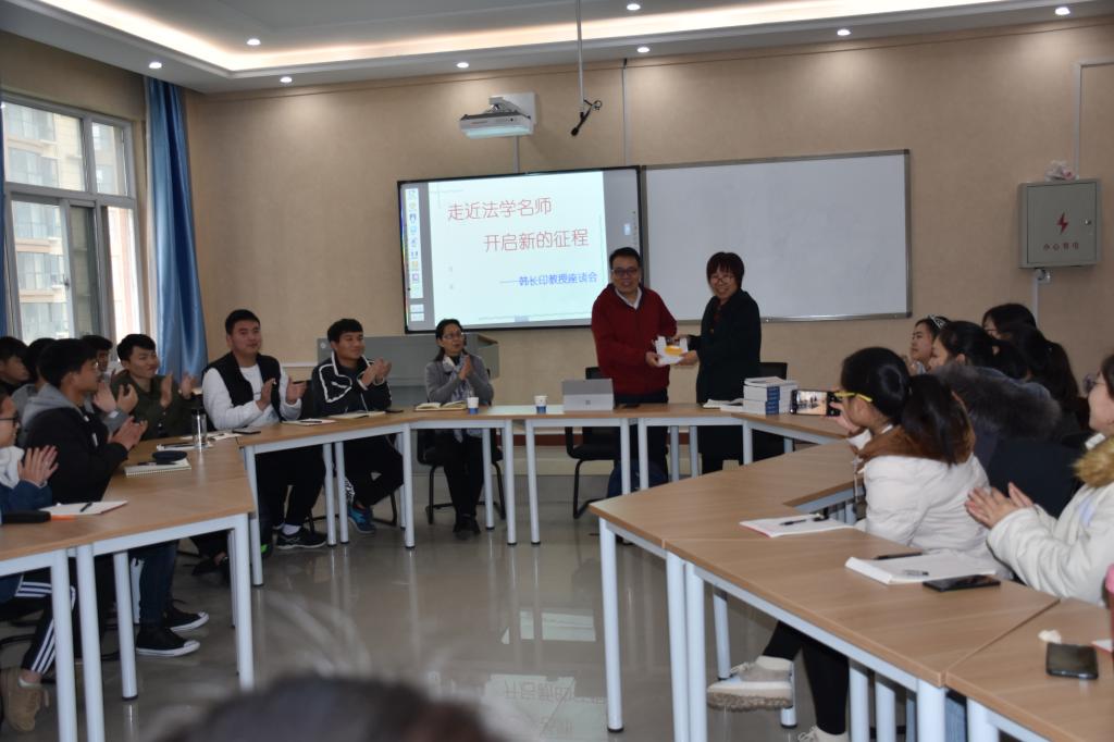 (通讯员魏丽君)12月4日上午,“走近法学名师 开启新的征程”——韩长印教授座谈会暨赠书仪式在太阳成tyc122cc集团422学科交流中心举行。太阳成tyc122cc集团经理王艳芳、副经理王芹萼、2018级全体员工以及部分教师代表参加座谈会。座谈会由王艳芳主持。