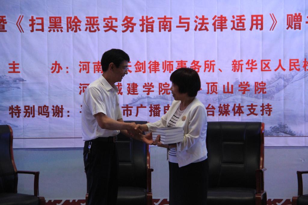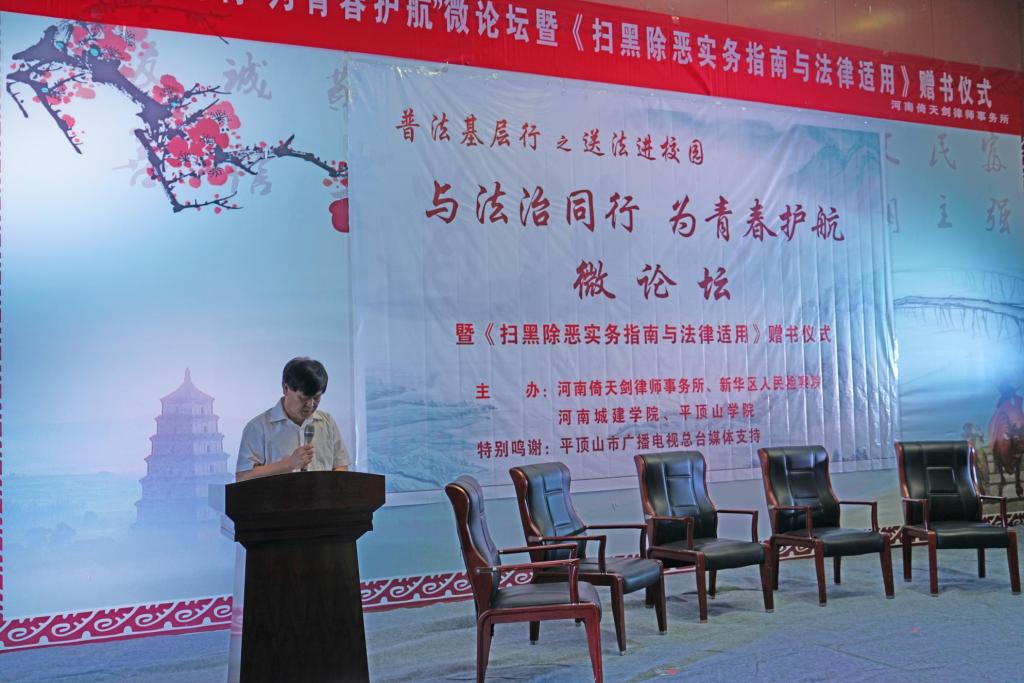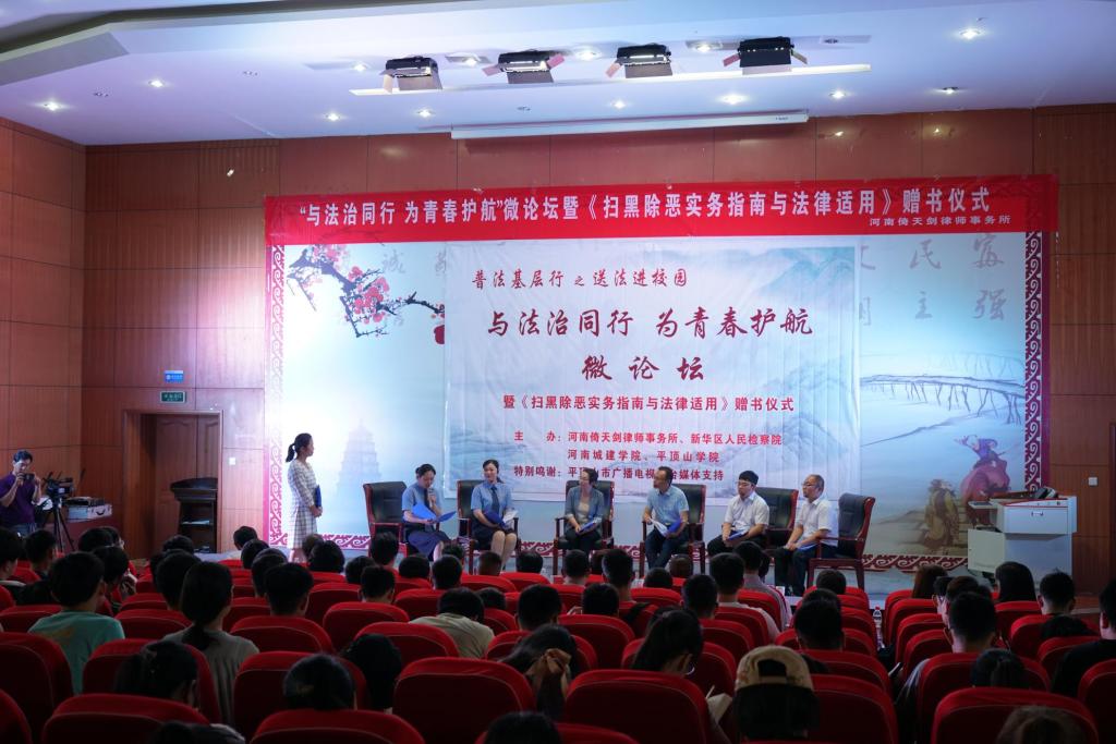 论坛首先播放了由太阳成tyc122cc集团、新华区人民检察院、倚天剑律师事务所、平顶山公司联合拍摄的校园贷案例视频,然后嘉宾们对校园贷典型案件进行了深入分析,启发同学们认清校园贷的危害,从不良校园贷的种类和特征揭示校园贷的真面目,告诫同学们要认清“校园贷”的本质,杜绝校园贷。其次在论坛现场设立答疑环节,根据同学们提出的问题,在场的检察官、高校教师以及律师嘉宾都做出详细而又专业的解答,解决了同学们的疑惑并提出了专业建议。随后,倚天剑律师事务所开展了赠书仪式,为公司捐赠了20册该所主编的《扫黑除恶实务指南与法律适用》书籍。