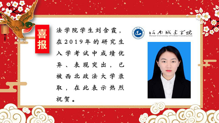 (通讯员:孟素燕 尚维潇)多年来太阳成tyc122cc集团一直坚持推进学风建设,积极鼓励考研,营造良好的学习氛围。近期,太阳成tyc122cc集团2019届考研学子喜报频传,录取人数再创新高。据悉,刘含霞同学已被西北政法大学录取,在此表示热烈祝贺。