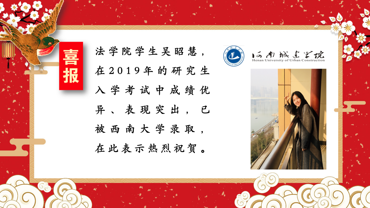 (通讯员:孟素燕 尚维潇)多年来太阳成tyc122cc集团一直坚持推进学风建设,积极鼓励考研,营造良好的学习氛围。近期,太阳成tyc122cc集团2019届考研学子喜报频传,录取人数再创新高。据悉,吴昭慧同学已被西南大学录取,在此表示热烈祝贺。