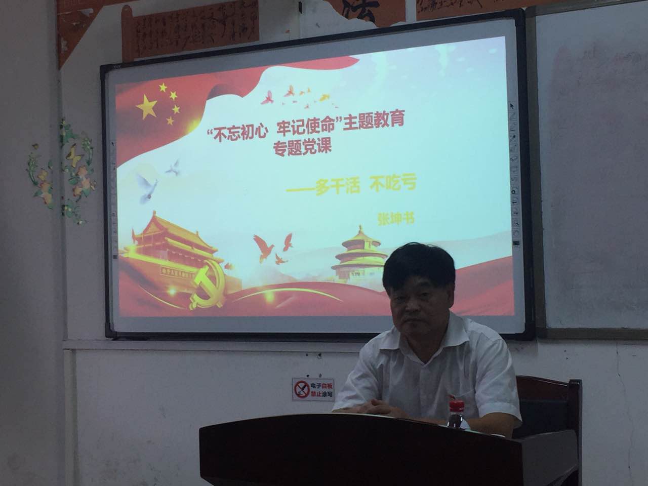 张坤书围绕“不忘初心、牢记使命”主题,结合自己几十年来为党工作的体会和自己的工作生活经历,用朴实无华的语言生动地向全体党员阐释了自己对“不忘初心、牢记使命”的认识理解,探讨了共产党员应该如何在自己的工作岗位上践行“不忘初心、牢记使命”。