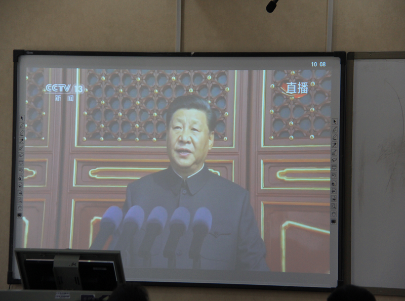 上午10时整,庆祝中华人民共和国成立70周年大会在天安门广场正式开始,现场师生全体起立,共唱国歌。随后,大家共同聆听了中共中央总书记、国家主席、中央军委主席习近平发表的重要讲话,习近平总书记的讲话更是让现场师生倍感振奋。在备受瞩目的阅兵式上,一个个整齐昂扬的方队和令世人震撼的武器装备,让大家见证了祖国强大的综合国力,先进的国防武器。那壮观的场面使大家深深的感到祖国在发展,科技在创新,从一无所有到无所不有的自豪感涌上在座师生们的心头。现场气氛热烈,掌声不断。