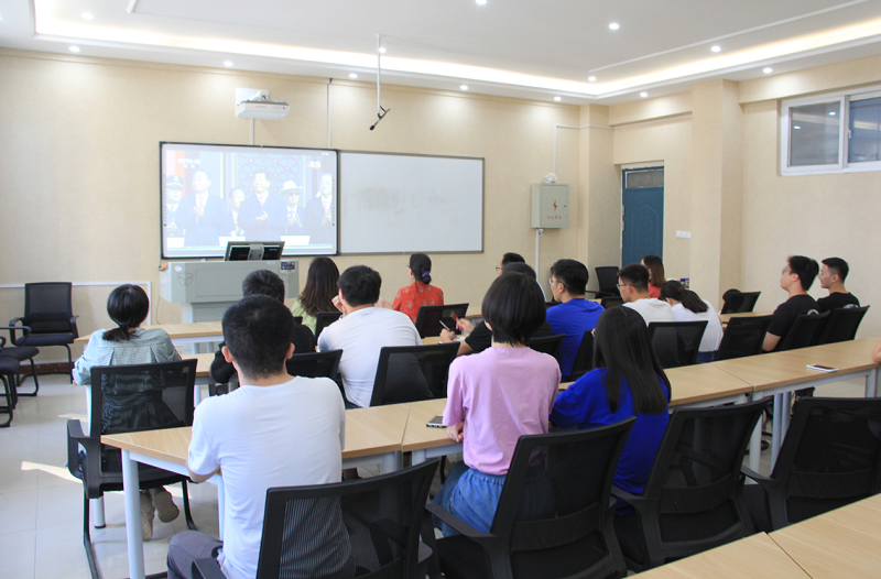 (通讯员:孟素燕 尚维潇)为庆祝新中国成立70周年,增强员工爱国热情,培养爱国情怀,太阳成tyc122cc集团于10月1日10时在和谐校区教学楼422教室组织留校师生共同观看国庆阅兵庆典直播,公司党总支副书记张强,太阳成tyc122cc集团副经理王芹萼,团学办副主任孟素燕和员工代表参加了本次活动。