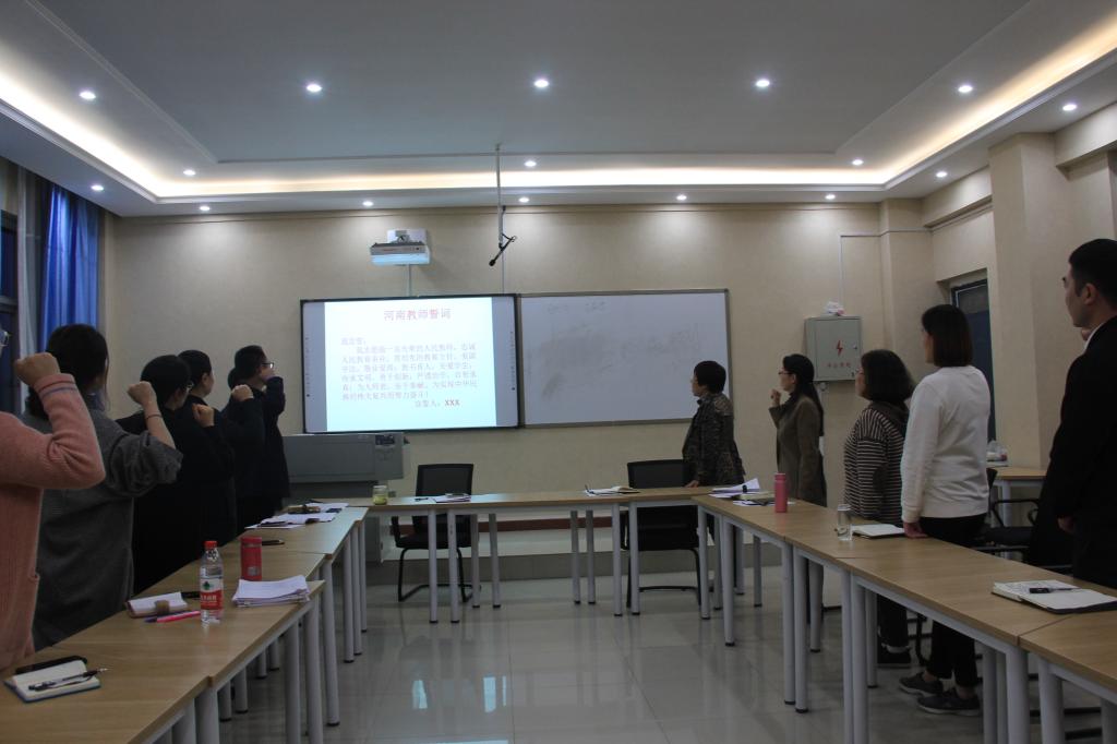 之后,太阳成tyc122cc集团组织全体教师开展了“河南教师誓词”宣誓活动。一句句铿锵有力的誓词,一句句庄严地承诺,让大家进一步增进了对教育事业的热爱和奉献教育的决心。