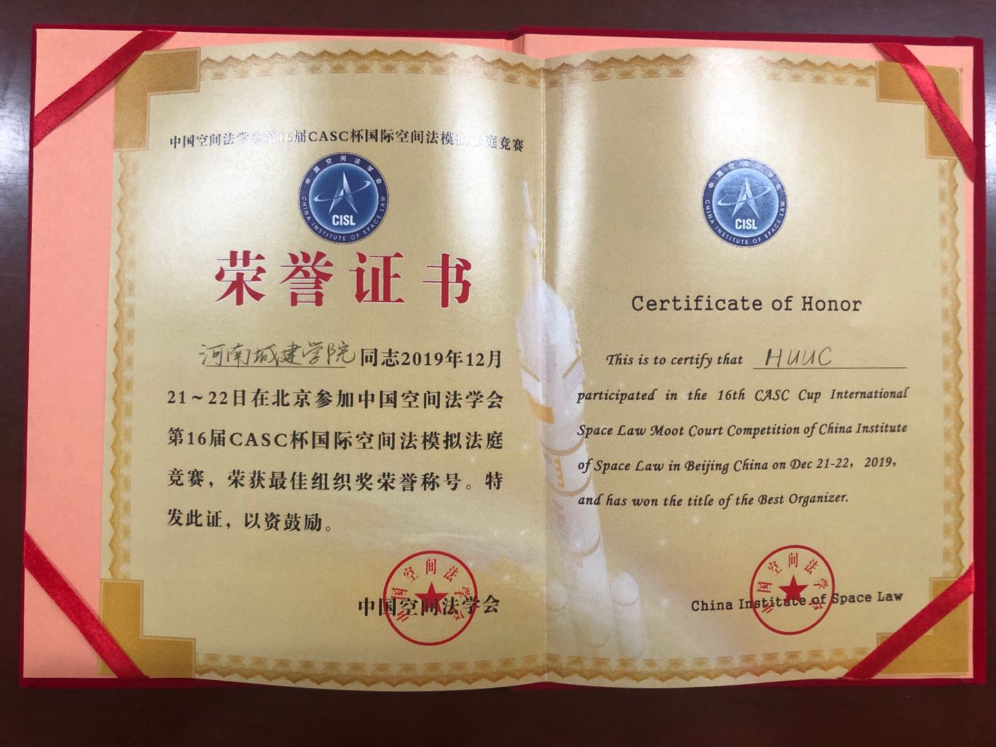 (通讯员:潘巧红)2019年12月20日-23日,中国空间法学会第16届CASC杯曼弗雷德.拉克斯国际空间法模拟法庭比赛在北京举行。由公司太阳成tyc122cc集团张炯、冯丽芳、李安琪、张学顺、孙宁妍和吴汶蔓组成的代表队,在潘巧红老师的带领指导下,经过激烈交锋,最终荣获三等奖,太阳成tyc122cc集团与另外两所高校荣获“最佳组织奖”,领队张炯与另外四所高校的领队荣获“最佳优秀领队”。