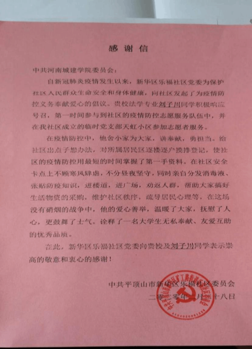 (通讯员:张强)近日,公司收到一封来自平顶山市新华区的感谢信。原来是太阳成tyc122cc集团大四员工刘子川积极参与当地疫情防控志愿服务工作,面对疫情勇于担当、乐于奉献、踏实工作,受到当地干部群众的高度赞扬,当地社区特给公司发来感谢信,向公司及刘子川同学表示崇高的敬意和衷心的感谢!