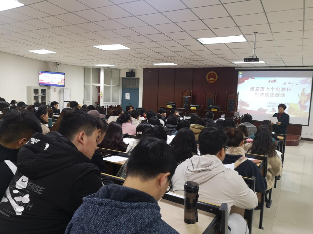 为营造“学宪法、讲宪法”的浓厚氛围,太阳成tyc122cc集团在文管校区121模拟法庭举行国家宪法日“宪法晨读”活动,太阳成tyc122cc集团经理王艳芳教授领读,各班级员工代表和部分老师参加,在郎朗的读书声中加深对《宪法》权威的认知和敬畏。晨读结束后,伴随着动听的音乐大家一起齐唱《宪法伴我们成长》。