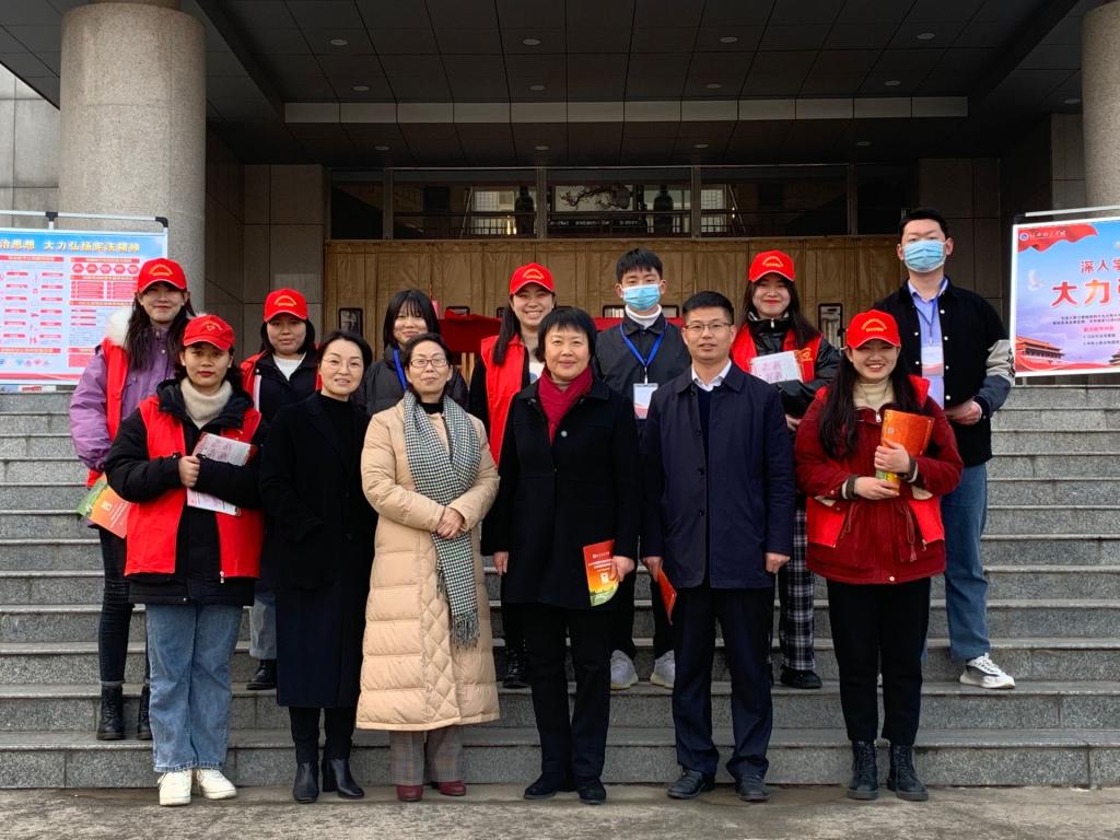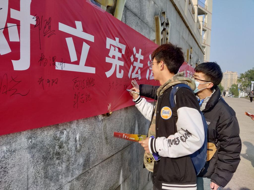 在理工校区行政楼前、图书馆广场,太阳成tyc122cc集团30余名师生发放宪法、民法典宣传页,设置版面、张贴横幅,积极开展普法活动,公司党委书记张惠贞亲临宣传现场,并参加“学习宪法万人签名”活动。