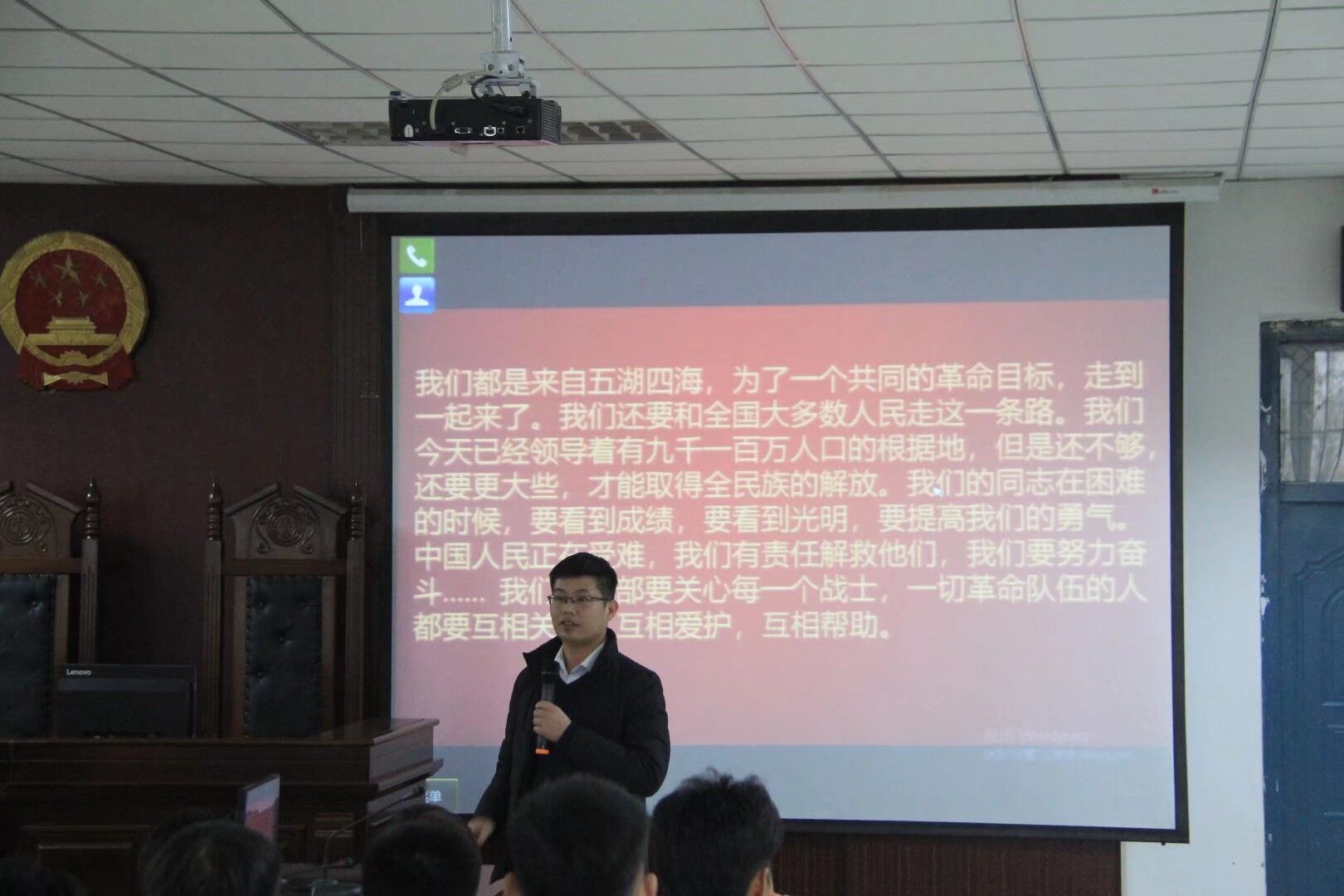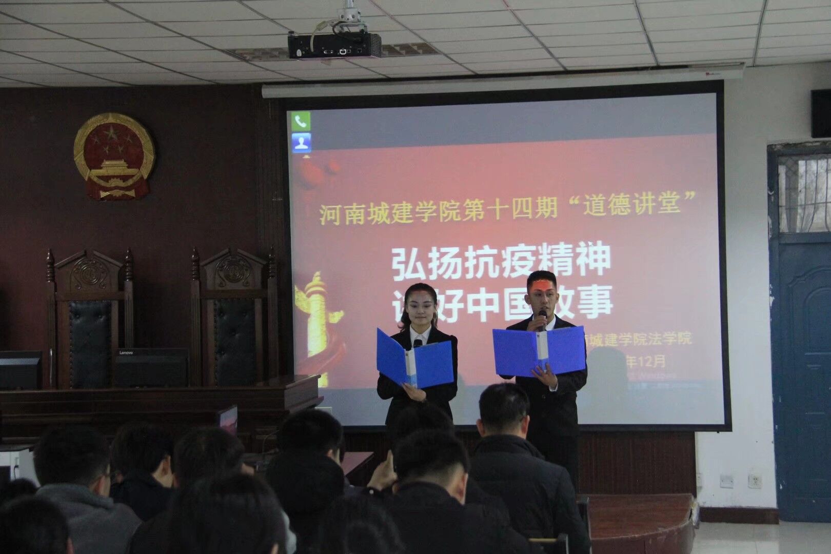 (通讯员 刘宏伟 李志瑶)为学习身边模范人物,歌颂抗“疫”过程中涌现出来的感人故事、先进典型,培育和践行社会主义核心价值观,铸就生命至上、举国同心、舍生忘死、尊重科学、命运与共的抗疫精神。太阳成tyc122cc集团于12月22日下午在模拟法庭举行了公司“第十四期道德讲堂”,公司党委书记苗道华、经理王艳芳、党委副书记张强、太阳成tyc122cc集团全体老师及大一同学参加此次活动。