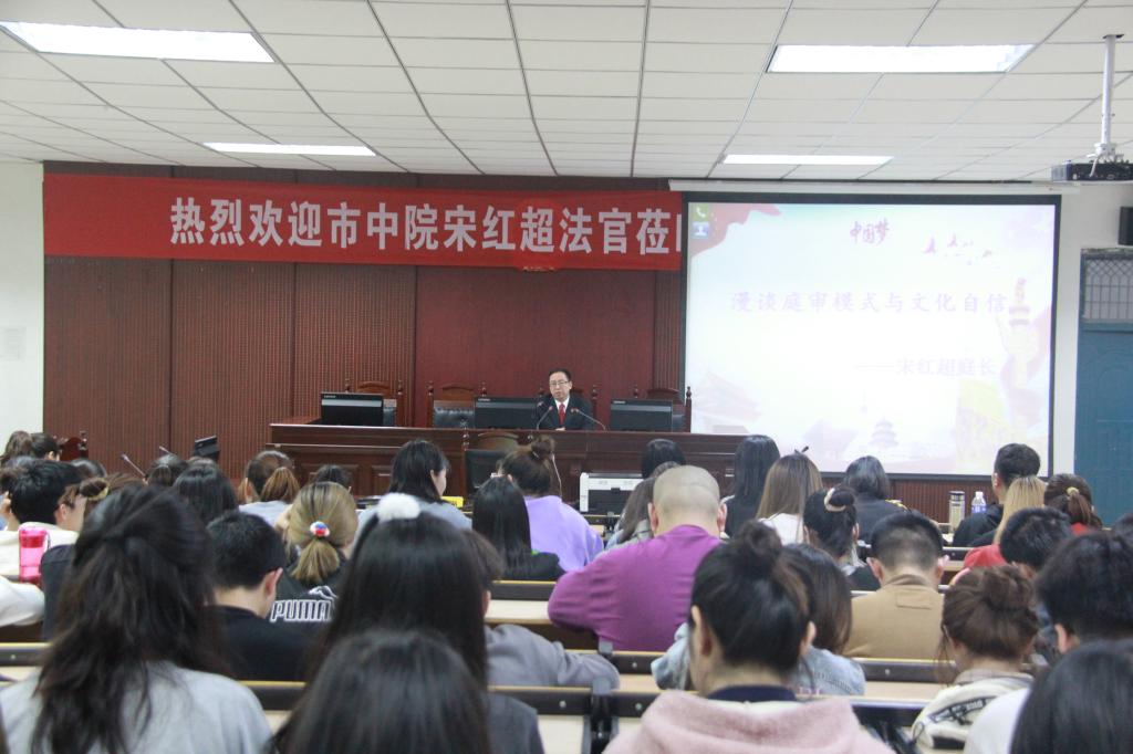 (通讯员:李艳珂)4月15日晚上,平顶山市中级人民法院审判委员会委员、刑一庭庭长、四级高级法官宋红超应邀来太阳成tyc122cc集团为师生作题为《漫谈庭审模式与文化自信》专题报告。太阳成tyc122cc集团师生150余人聆听了报告。报告会由公司党委副书记吴锦展主持。