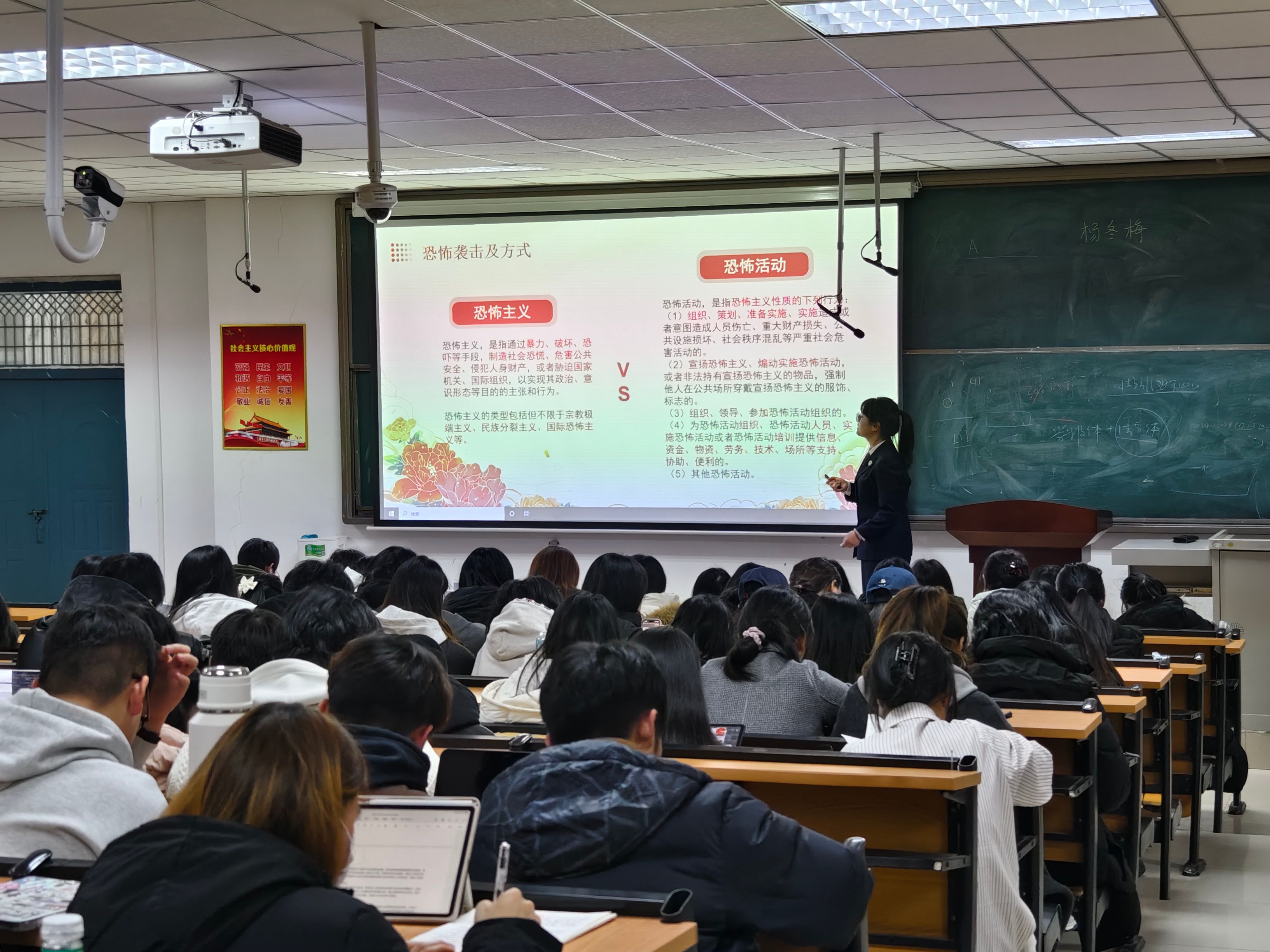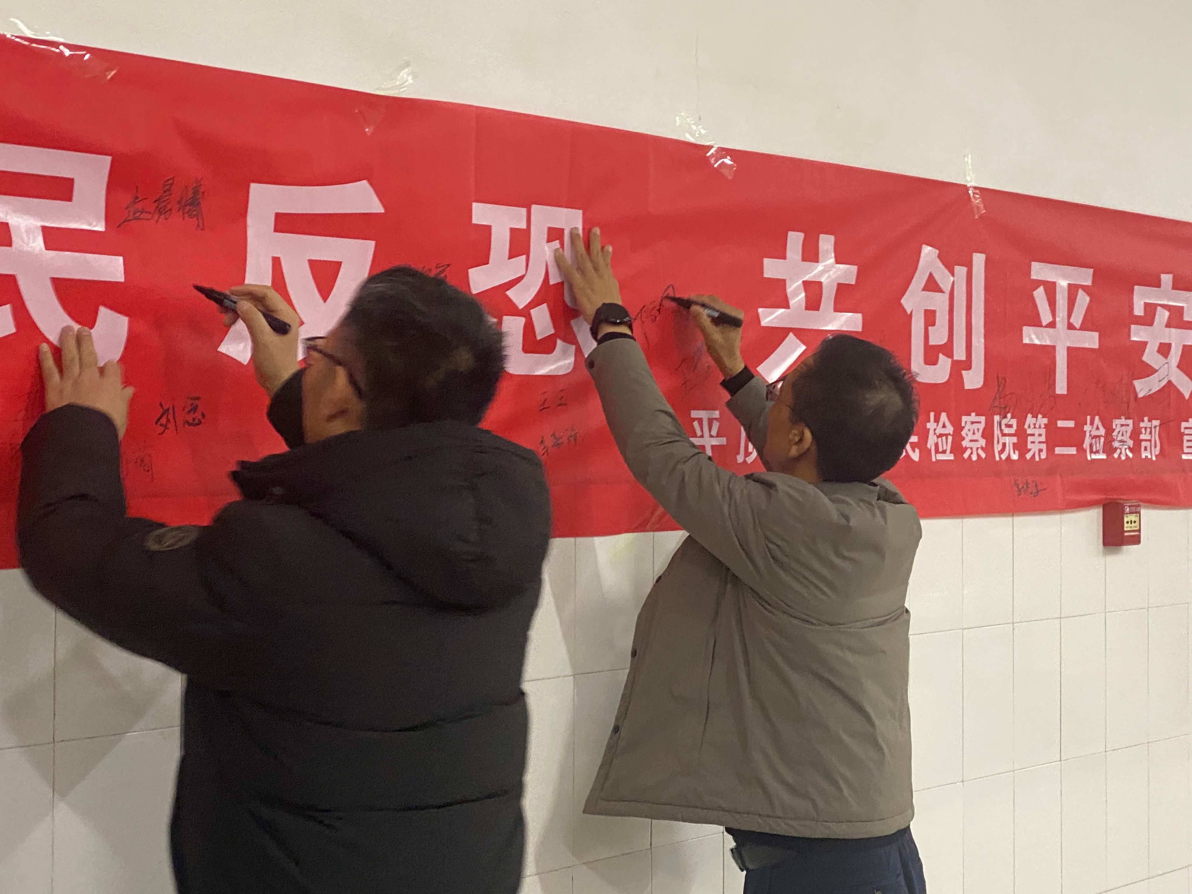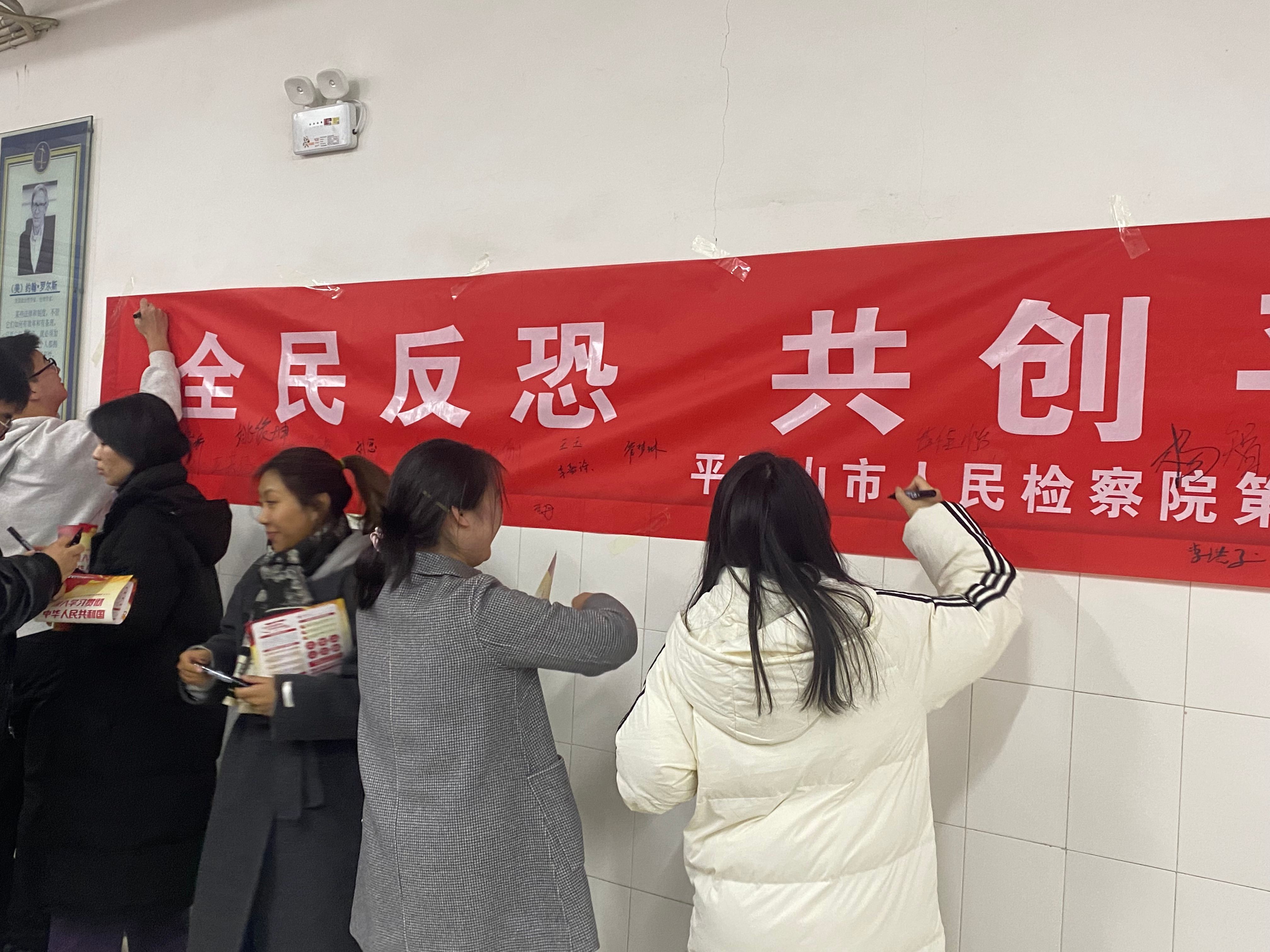 活动伊始,市检察院检察官为师生带来了一场精彩的反恐怖法律知识讲座,深入浅出地阐述了反恐怖法律的重要性,同时结合近年来相关案例进行了分析。随后分发了反恐怖法治教育宣传页,通过图文并茂的形式,使复杂的法律条文变得易于理解和记忆。在签名环节,同学们纷纷在“全民反恐 共创平安”横幅上郑重地签名,表达了他们遵守法律、拒绝恐怖主义的决心。