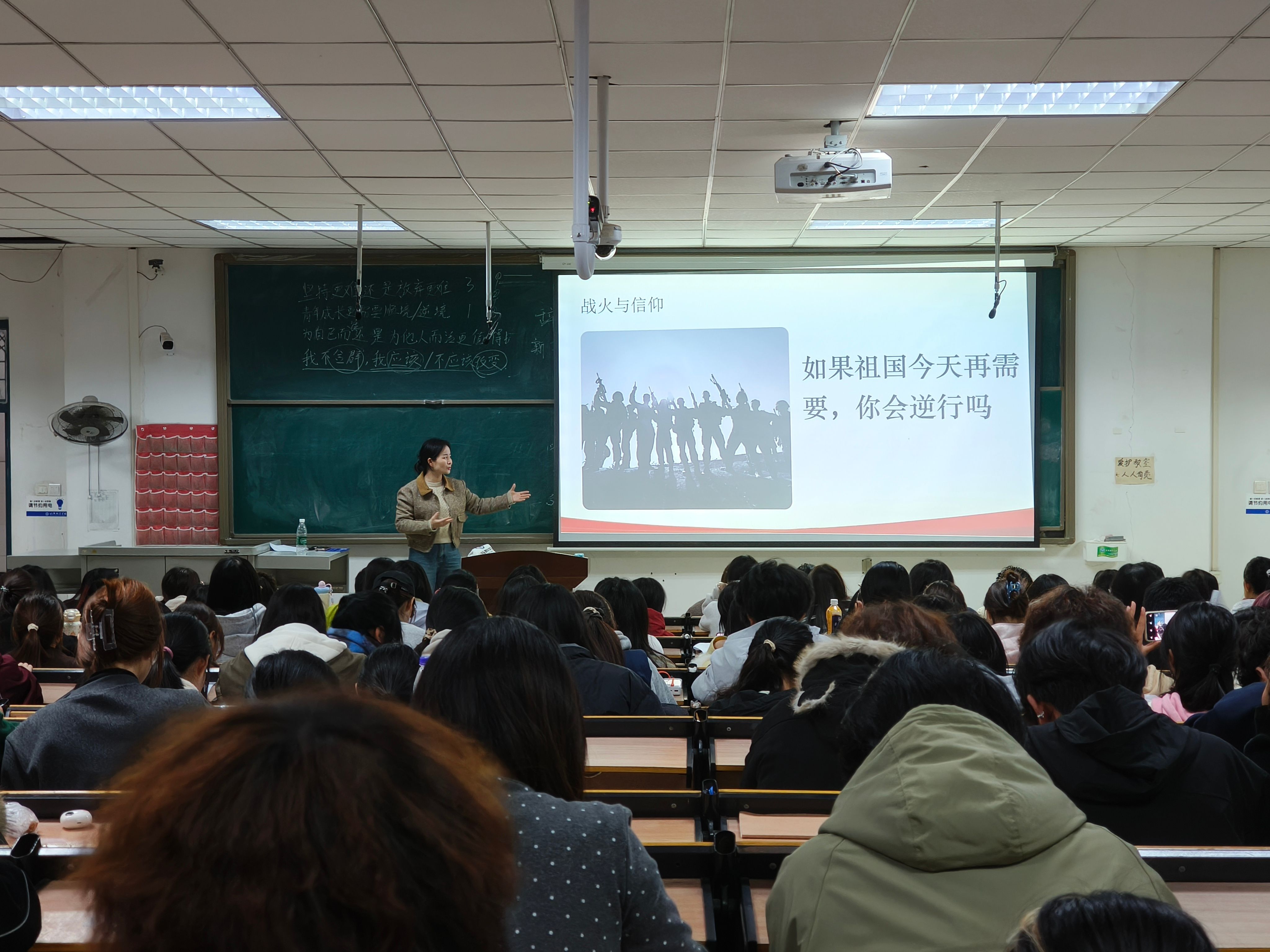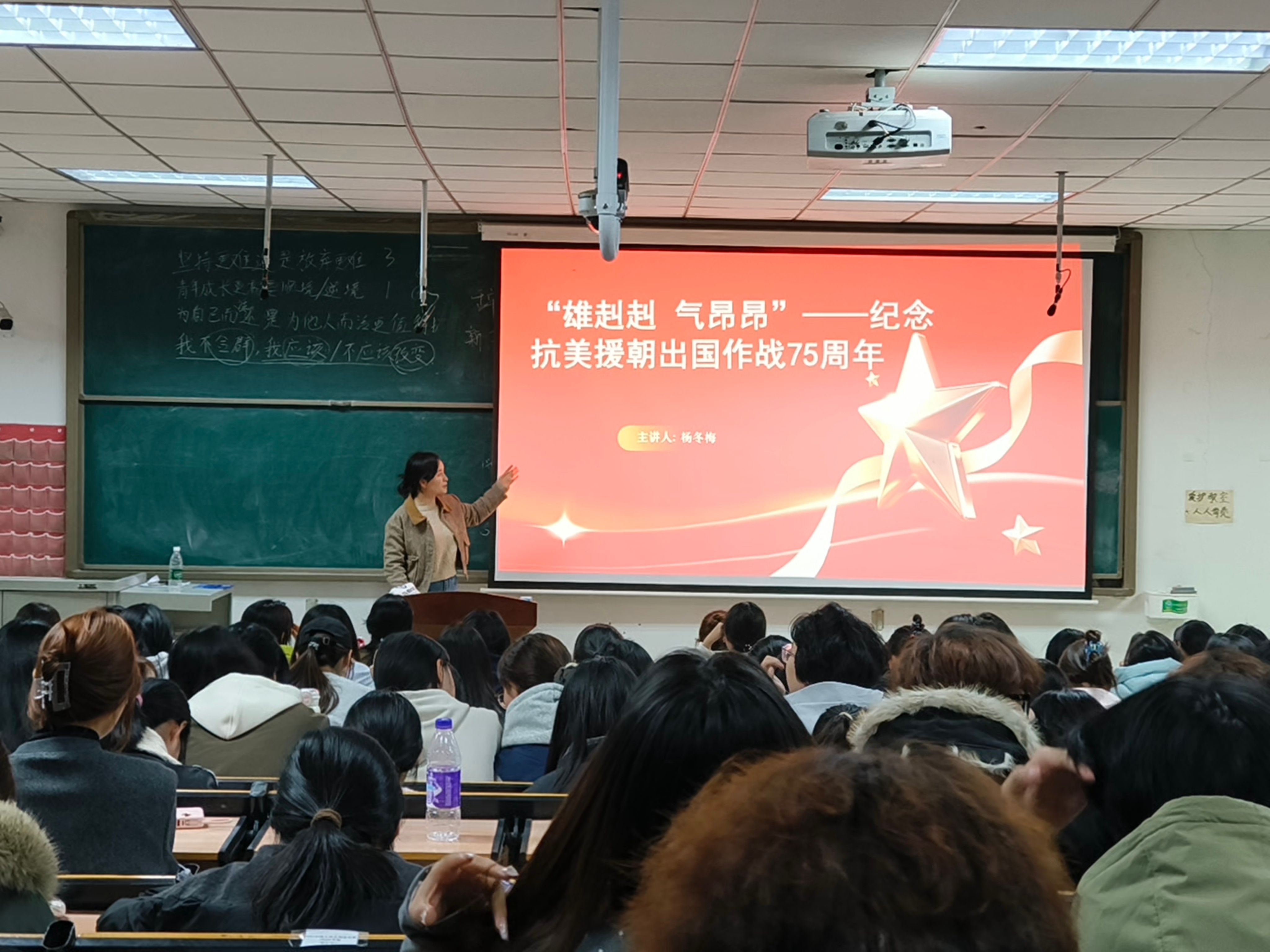 为纪念中国人民志愿军抗美援朝出国作战75周年,10月27日晚,太阳成tyc122cc集团团委在1#228教室举办“铭记抗美援朝历史 弘扬爱国主义精神”主题团课,太阳成tyc122cc集团团学办主任杨冬梅老师做专题报告,太阳成tyc122cc集团团员青年100余人参加活动。