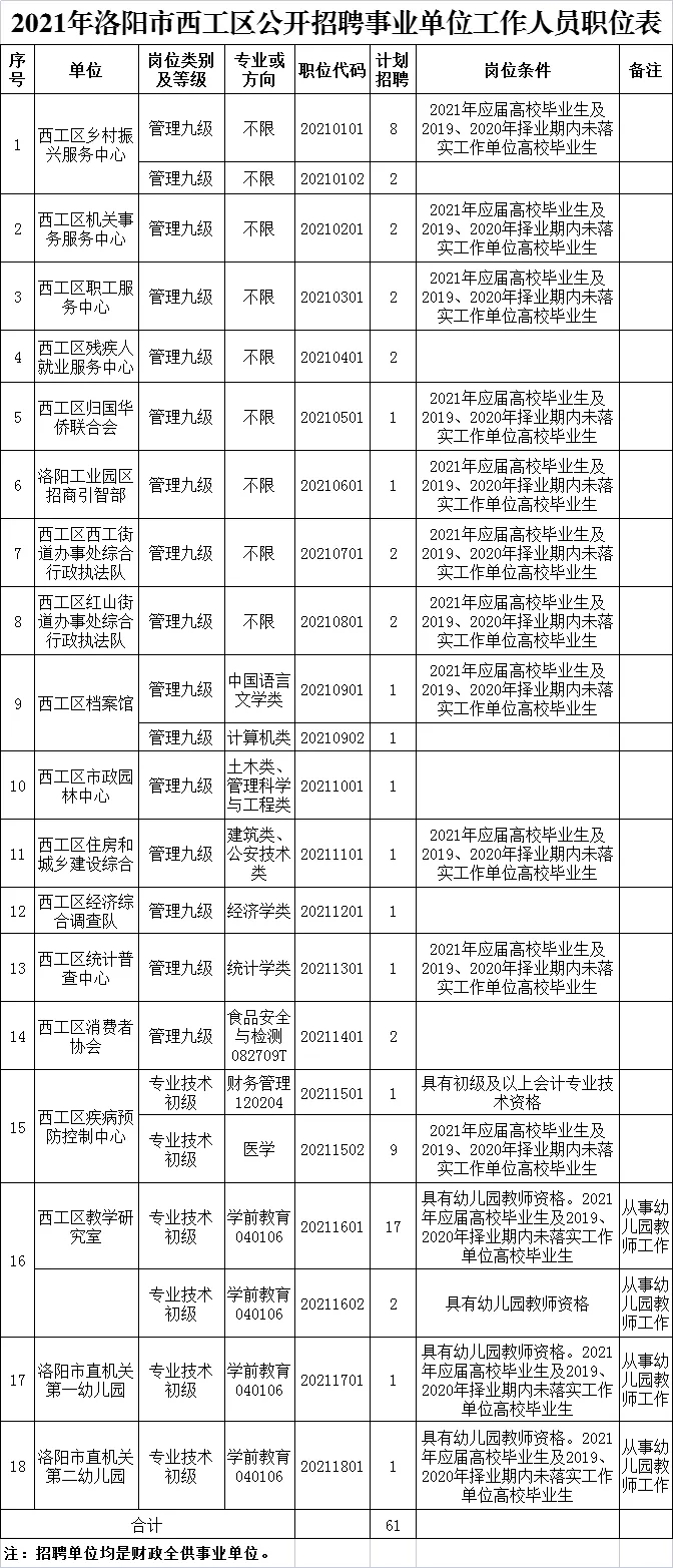 详见《2021年洛阳市西工区公开招聘事业单位工作人员职位表》(附件1)。