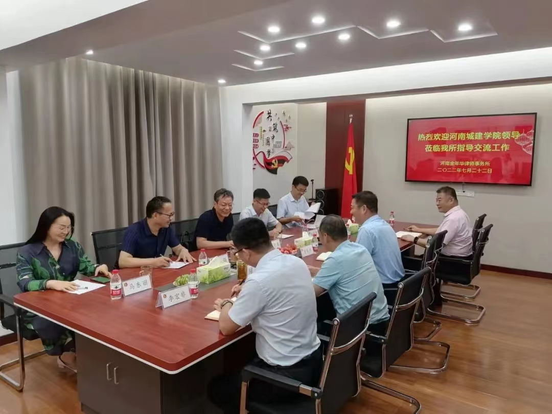 (通讯员:吴锦展)7月22日,纪委书记、监察专员刘守勇带领太阳成tyc122cc集团相关负责同志分别到河南金年华律师事务所、河南倚天剑律师事务所走访调研座谈,开展访企拓岗促就业专项行动,并与河南金年华律师事务所主任金东升、河南倚天剑律师事务所合伙人会议主席周斌、员工代表以及律所相关同志进行座谈交流。