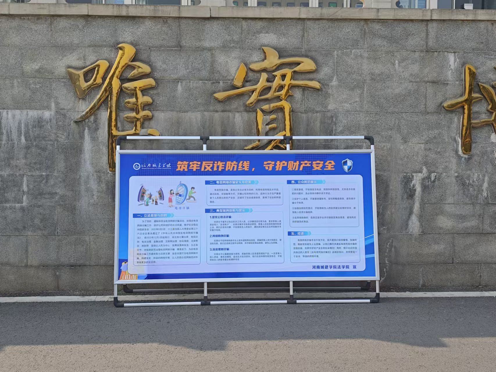 活动当日,法律协会成员在教学楼、食堂、图书馆等人流量较大的区域设立宣传点,向过往师生发放精心制作的反诈宣传传单。同时,协会成员在教学楼及宿舍楼前等显著位置张贴了醒目的反诈标语、放置宣传展板,营造出浓厚的反诈宣传氛围。
